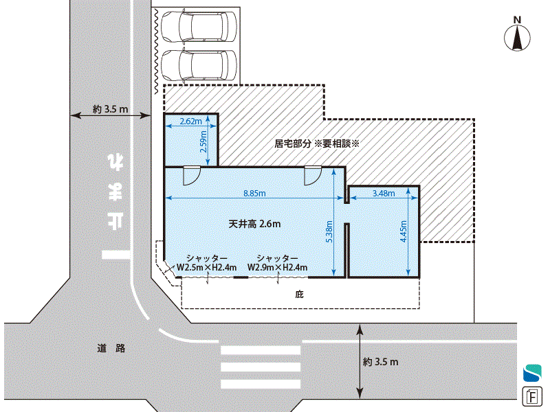 必ずしも営業可能な業種とは限りませんので用途地域の制限等弊社担当までご確認ください。 - 大型車両欄の「可」の表示については前面道路幅員が概ね6m以上の道路として住宅地図上から判断したものです。実際については現地をご確認ください。