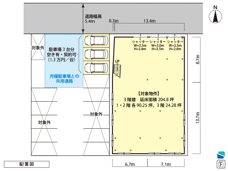 | 道路幅員 | 北 5.4m | 駐車場 | 有 駐車可能台数:3台 (月額13,000円/台) |