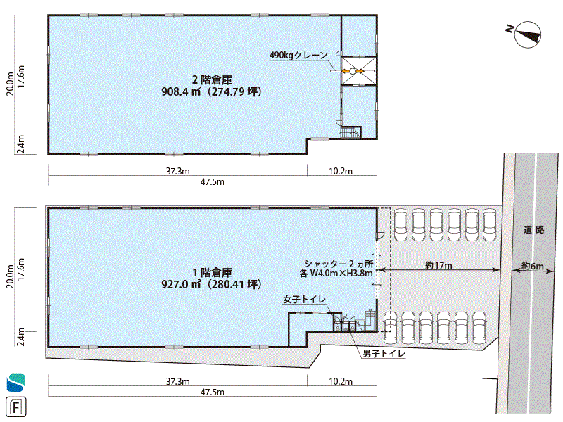 | 各階面積 | 1F:927.m²/280.41坪 2F:908.4m²/274.79坪 | ||