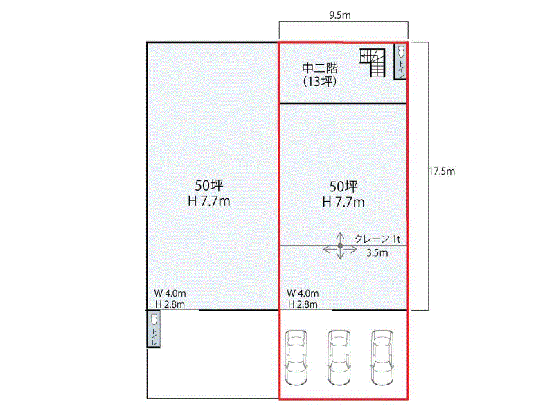 | 設備関連 | 1tクレーン1基(残置物) トイレ 中2階あり 電気引き込み有 | ||