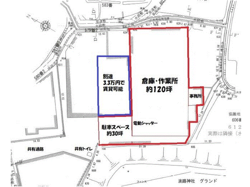 | 設備関連 | 動力電源 共有トイレ 電動シャッター 事務所有 | ||
