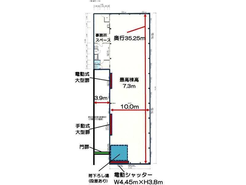 | シャッター | H: 3.8m W: 4.45m |